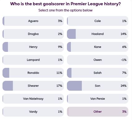 그런데 놀랍게도 손흥민이 그들과 나란히 이름을 올렸다. 투표 현황(13일 오전 11시 기준)에 따르면 손흥민은 24%의 지지를 얻어 시어러(17%), 엘링 홀란(14%), 호날두(11%) 등을 압도하며 1위를 달리고 있다.