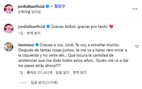 메시는 해당 게시글의 댓글을 통해 "고마워, 조르디. 정말 많이 그리울 거야. 이렇게 오랜 시간 함께했는데 왼쪽을 돌아보면 네가 없다는 사실이 이상할 것 같아. 네가 내게 해준 어시스트가 참 많더라. 누가 이제 내 뒤에서 패스를 해줄까"라며 아쉬움을 표했다.