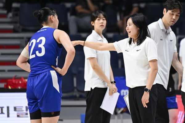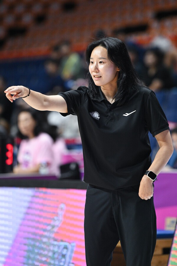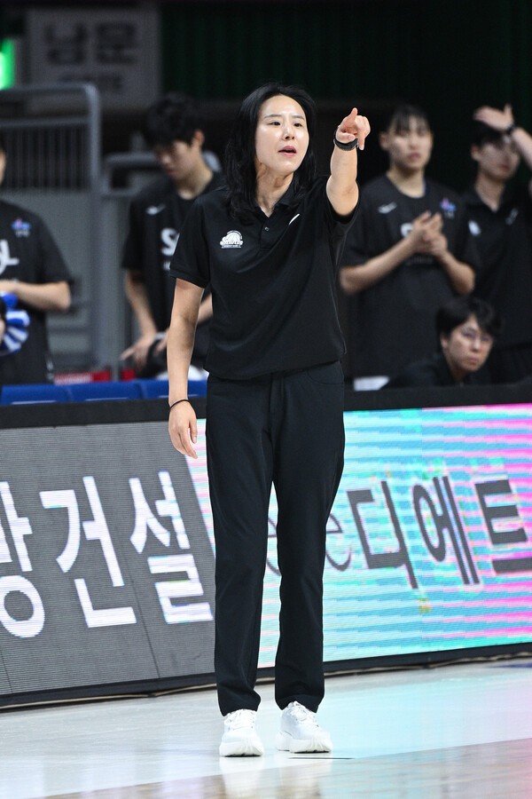 [SPORTALKOREA=용인] 이정엽 기자= 지난 2일 경기도 용인시에 위치한 신한은행 블루캠퍼스에서 열린 신한은행 에스버드와 삼일중학교의 경기. 최윤아 신한은행 감독은 평소와 같이 코트 밖에서 선수들을 지휘했다. 다만, 다른 지도자와는 태도 자체가 달랐다. 경기 도중 한 차례도 벤치에 앉지 않고 쉼 없이 선수들과 호흡했다. 하나의 사소한 틈도 놓치거나 허용하지 않겠다는 의지가 가득했다.