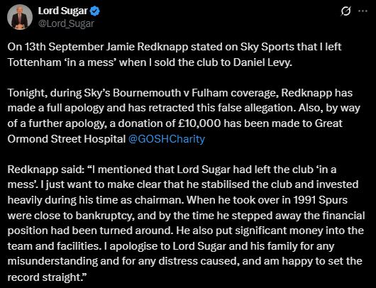 이후 제이미는 별다른 반응을 보이지 않다가 한 달 만에 슈거에게 정식으로 사과했다. 그는 '프라이데이 나이트 풋볼' 생중계를 진행하던 중 "슈거가 클럽을 난장으로 남겼다고 말했지만, 이는 사실과 다르다. 그는 회장 재임 기간 동안 클럽을 안정시키고 막대한 투자를 했다"며 "1991년 취임 당시 토트넘은 사실상 파산 직전이었지만, 그가 물러날 때 재정 상태는 완전히 회복됐다. 팀과 시설에도 상당한 금액을 투자했다. 슈거와 그의 가족에게 오해와 불편을 끼친 점 사과드리며, 기록을 바로잡는다"고 고개를 숙였다.