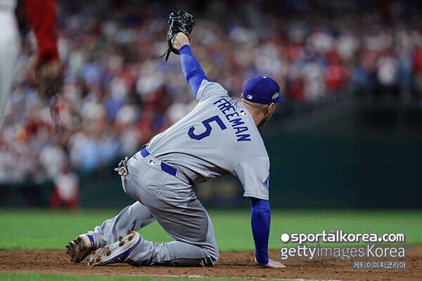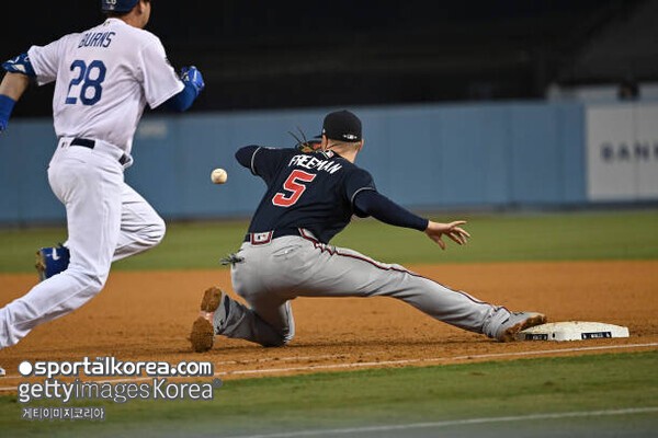 에드먼의 송구가 짧았다. 프리먼에게 닿기 전에 땅에 튀었다. 숏바운드 처리가 필요했다. 하지만 프리먼은 프리먼이었다. 무릎을 꿇어가며 공을 건져냈다. 이후 중심을 잃고 흙바닥에 나뒹구는 와중에도 공은 글러브에 안겨 있었다.