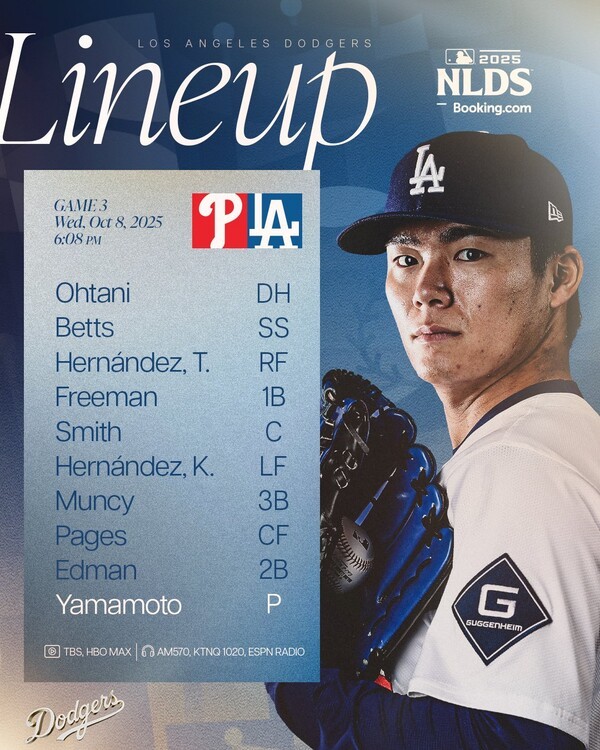 김혜성은 9일(이하 한국시각) 미국 캘리포니아주 로스앤젤레스의 다저 스타디움에서 열리는 필라델피아 필리스와의 2025 MLB 내셔널리그 디비전 시리즈(NLDS) 3차전 라인업에서 제외됐다.