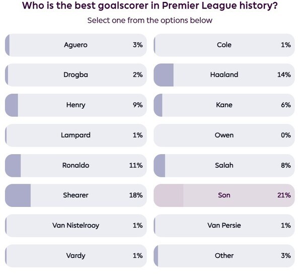 흥미로운 점은 팬들의 투표 결과다. 10일 오후 4시 기준 손흥민은 전체 투표의 21%를 얻으며, 프리미어리그 통산 최다 득점자(260골)인 시어러(18%)를 제치고 1위에 올라섰다. 물론 해당 투표는 인기 투표 성격이 강하지만, 팬들이 손흥민이 정통 스트라이커가 아님에도 불구하고 보여준 킬러 본능을 높게 평가한 것으로 풀이된다.
