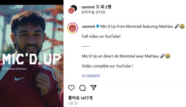다만 단순히 장면만 찍는 것이 아닌 대표팀 미드필더 마티외 슈아니에르에게 마이크를 부착해 생생한 현장감을 더했다.