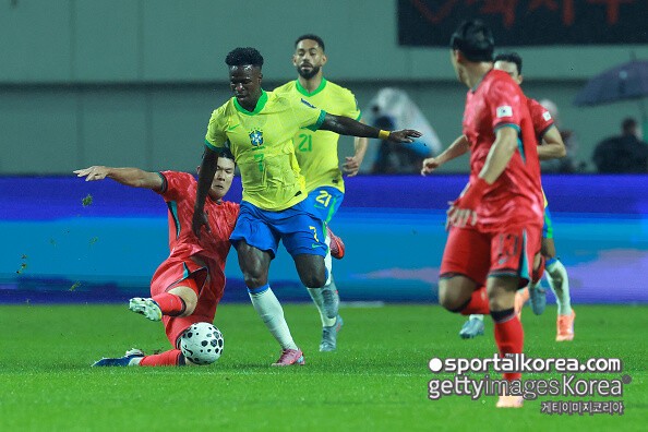 초반 김민재는 몇 차례 인상적인 수비를 보여줬다. 특히 전반 23분 브라질의 역습 상황에서 비니시우스 주니오르의 드리블을 태클로 끊어내기도 했다.