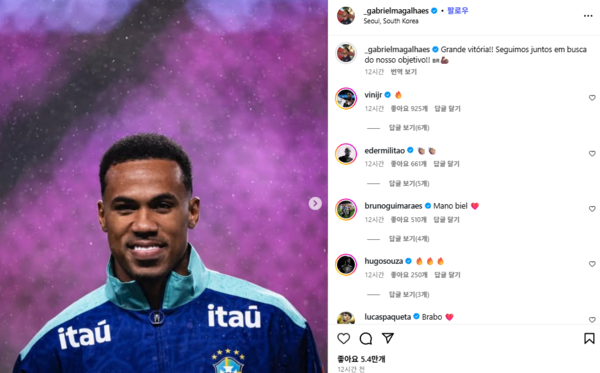 매체가 주목한 것은 마갈량이스가 자신 SNS에 업로드 한 게시물. 그는 10일 서울월드컵경기장에서 열린 대한민국 대표팀과의 친선전(5-0 브라질 승) 이후 이를 기념하기 위해 사진을 찍어 올렸고, "좋은 승리! 목표를 향해 함께 계속 나아가자!"고 코멘트를 덧붙였다.
