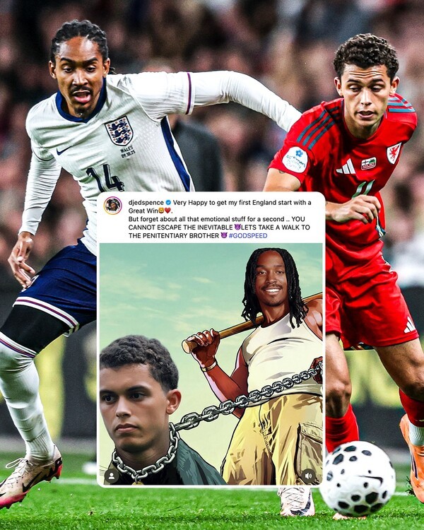 논란이 된 건 경기 후 SNS에 업로드한 게시물이었다. 스펜스는 "잉글랜드에서 첫 경기를 승리로 장식할 수 있어 매우 행복하다"며 "감정적인 건 잠시 접어두자. 형제여, 감옥으로 함께 가자"는 메시지와 더불어 토트넘 동료 브레넌 존슨을 목줄로 묶은 합성 사진을 공유했다.
