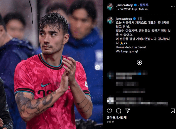 그는 “오늘 서울에서 처음으로 대표팀 유니폼을 입고 뛴 날. 결과는 아쉽지만 팬들의 응원은 정말 잊을 수 없어요. 이 순간을 평생 기억하겠습니다. 감사합니다”라고 한글로 전했다. 이어 “Home debut in Seoul. We keep going!(서울에서의 홈 데뷔전. 우리는 계속 나아간다!)”라는 문장으로 각오를 덧붙였다.