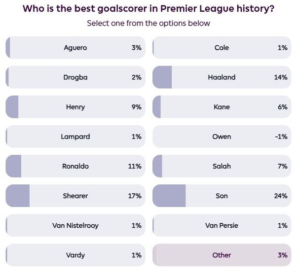 가장 주목할 부분은 팬 투표 결과다. 13일 0시 기준 손흥민은 전체 득표의 24%를 얻어 앨런 시어러(17%), 엘링 홀란(14%), 크리스티아누 호날두(11%), 해리 케인(6%) 등 쟁쟁한 후보들을 모두 제치고 1위를 유지 중이다.