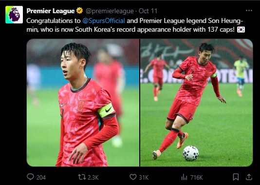 그리고 11일, 프리미어리그 사무국은 공식 SNS를 통해 “토트넘 홋스퍼와 프리미어리그의 전설 손흥민에게 축하를 보낸다. 그는 이제 A매치 137경기로 대한민국 대표팀 최다 출전 기록 보유자가 됐다"라며 또 한 번 이례적인 메시지를 남겼다.