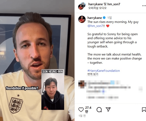 케인은 11일(한국시간) 자신의 SNS를 통해 “매일 아침 태양은 떠오른다. 내 친구 손흥민 ❤️ 어려운 시기를 겪던 어린 시절의 자신에게 해줄 조언을 솔직하게 나눠준 손흥민에게 정말 고맙다. 우리 모두가 정신 건강에 대해 더 많이 이야기할수록, 함께 긍정적인 변화를 만들어갈 수 있다”며 손흥민과의 영상통화 장면을 공개했다.