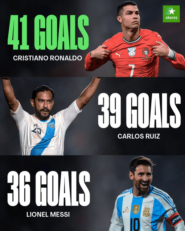 특히 눈여겨볼 대기록이 탄생했다. 호날두는 이날 멀티골을 뽑아내며 월드컵 예선 통산 최다 득점자(41골)로 올라섰다. 영국 매체 '토크스포츠'에 따르면 이전까지 호날두는 과테말라 출신 스트라이커 카를로스 루이스와 39골로 공동 1위였으며, 이번 경기에서 득점 행진으로 단독 선두로 올라섰다. 또한 리오넬 메시(36골)를 앞서게 됐다.