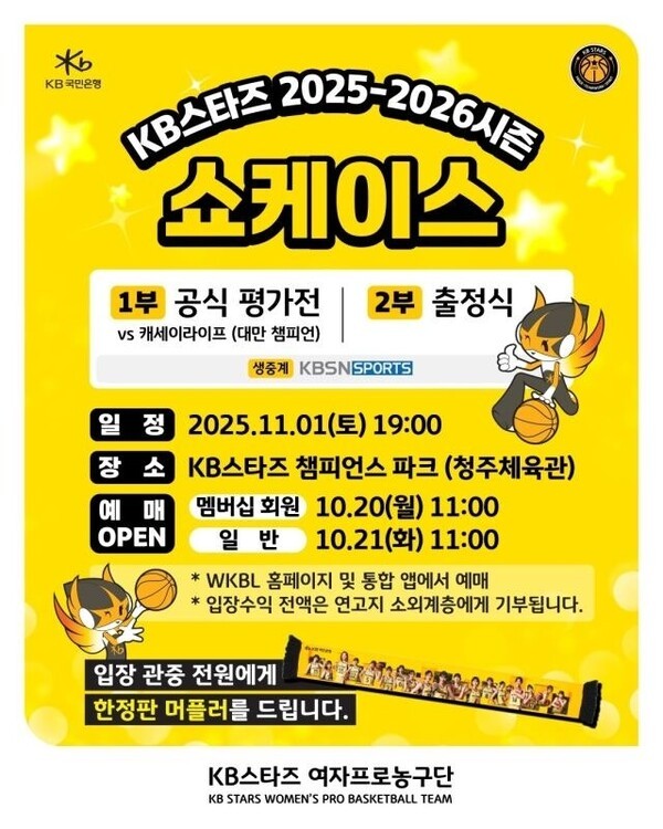 [SPORTALKOREA] 이정엽 기자= 청주 KB스타즈가 새 시즌 개막을 앞두고 오는 11월 1일 오후 7시 충청북도 청주체육관에서 ‘2025-2026시즌 쇼케이스(Show Case)’를 연다고 16일 밝혔다.