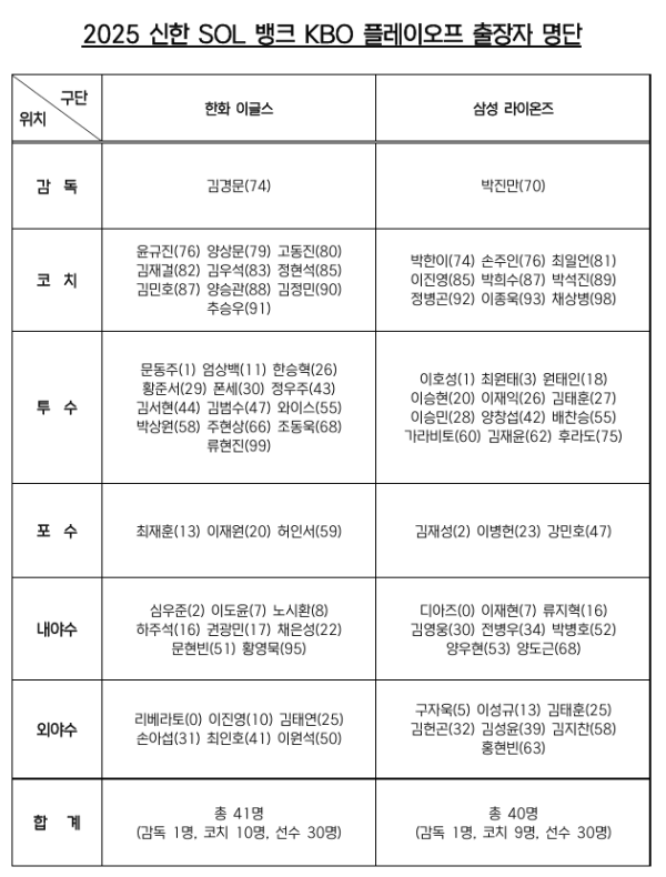 한국야구위원회(KBO)는 16일 2025 신한 SOL뱅크 KBO 플레이오프 출장자 명단을 발표했다.