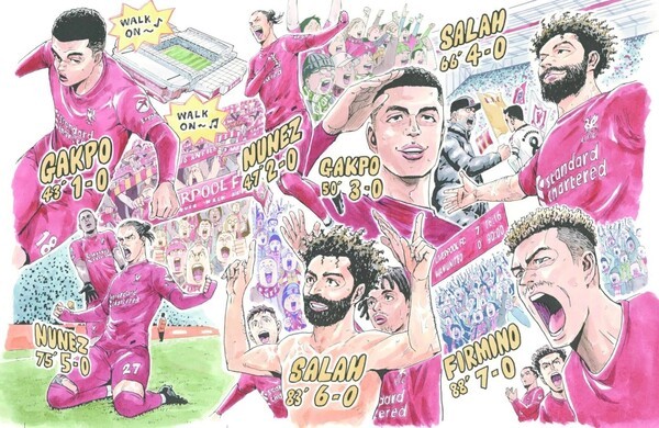 리버풀은 18일 구단 공식 채널을 통해 “2023년 3월 안필드에서 맨유를 7-0으로 꺾었던 역사적인 경기를 기념하기 위해 일본의 대형 출판사 코단샤가 특별한 만화 아트워크를 공개했다”고 전했다. 이어 “이번 작품은 당시 리버풀이 보여준 ‘그날의 감정’을 고스란히 담아낸 헌정 작품”이라고 소개했다.