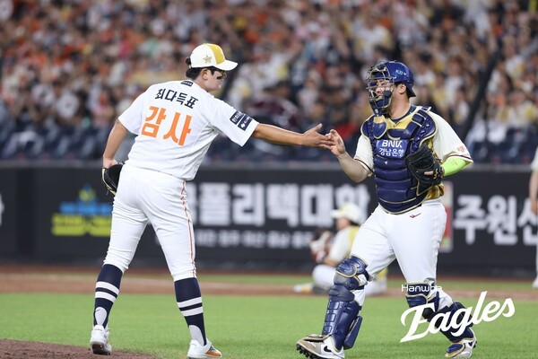 김경문 한화 감독이 곧바로 마운드를 방문해 김서현을 다독였다. 그런데 이번엔 불운이 겹쳤다. 김태훈의 먹힌 타구가 좌익수 앞에 뚝 떨어지는 ‘텍사스 히트’가 된 것이다. 그나마 강민호를 유격수 땅볼로 잡았으나 그 사이 1루 대주자 홍현빈은 2루에 안착했다.