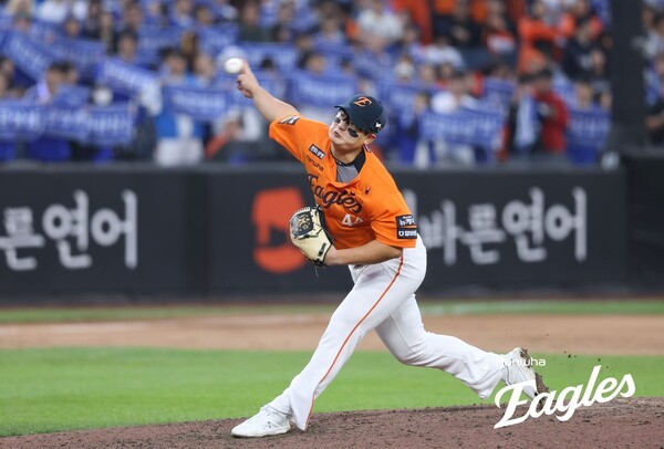 팀이 9-6으로 앞선 9회 초에 경기를 마무리하기 위해 등판한 김서현이다. 선발 투수 코디 폰세가 6이닝 6실점으로 부진했지만, 집중력을 발휘한 타선의 ‘몰아치기’와 구원 등판한 문동주의 호투로 승기를 잡아갔다.