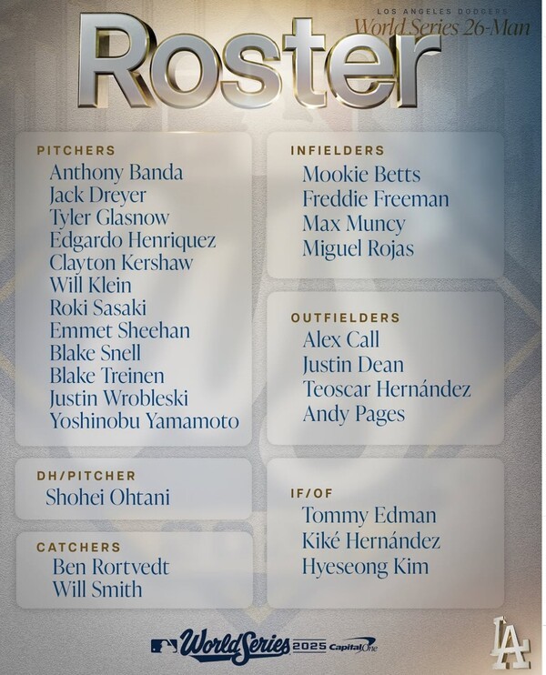다저스는 25일(한국시간) 캐나다 온타리오주 토론토 로저스 센터에서 열리는 2025 MLB WS 1차전 토론토 블루제이스와 원정 경기에 앞서 선발 출전 명단을 발표했다.