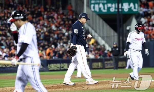 LG 흐름을 끊기 위해 포수 최재훈의 마운드 방문이 있었다. 그의 다독임도 통하지 않았다. 후속 박동원에 좌중간을 가르는 적시 2루타를 허용, 2점을 실점했다.