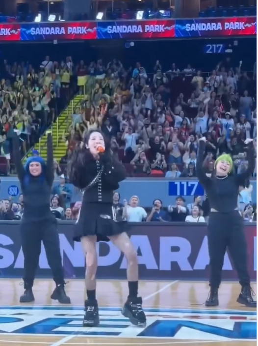 동영상을 보면 1만5000석 규모의 경기장이 사람들로 꽉 차 있다. 환호 속에 노래를 부른 산다라박은 노래를 마치고 라이징이글스와 하이파이브를 하며 그들을 응원했다.