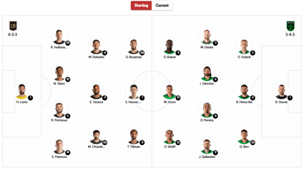 오스틴 FC의 니코 에스테베스 감독은 3-4-3 포메이션으로 맞섰다. 브래드 스튜버가 골문을 지키고, 수비는 올렉산드르 스바토크-브렌던 하인스 아이케-길례르미 비로가가 책임졌다. 미드필더진은 미켈 데슬레르-일리에 산체스-다니엘 페레이라-존 갤러거가 장악하며, 공격진에는 오스만 부카리-뮈르토 우주니-오언 울프가 포진했다.