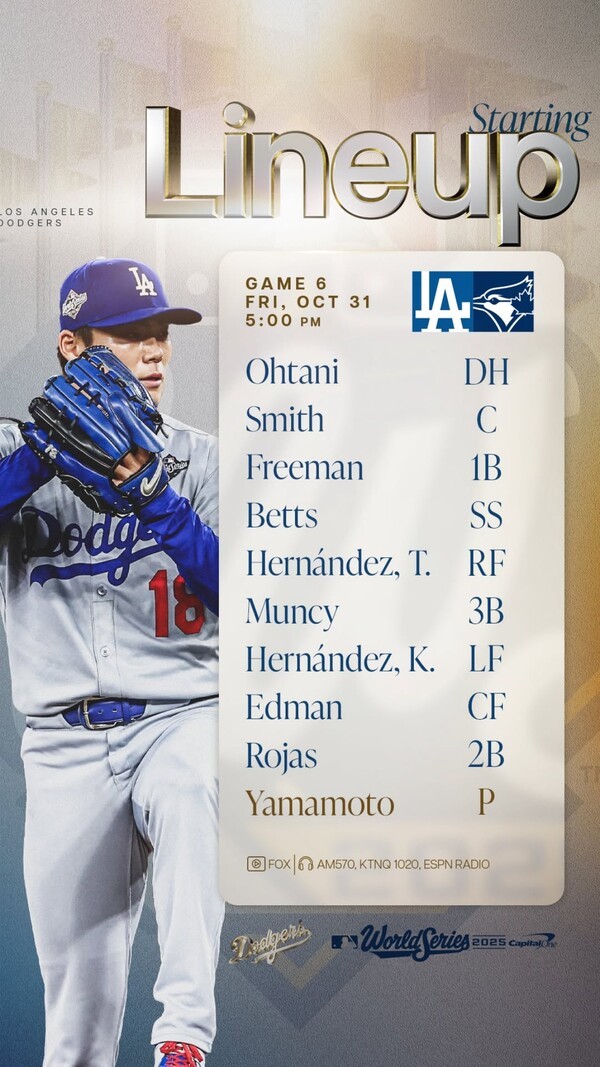다저스는 1일(한국시간) 토론토 캐나다 온타리오주 토론토 로저스 센터에서 열리는 토론토 블루제이스와 월드시리즈(WS) 6차전을 앞두고 선발 라인업을 발표했다.
