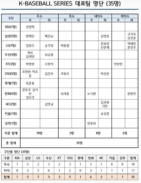 한편, KBO 전력강화위원회는 지난달 12일 대표팀의 명단을 확정했다. 대표팀은 투수 18명, 포수 3명, 야수 14명 등 총 35명으로 구성됐다. 대표팀 선수 중 LG 문성주와 삼성 구자욱은 각각 엉덩이 중둔근과 옆구리 부상으로 대표팀 합류가 불발됐고, 대체 선수로 상무 이재원이 선발됐다.