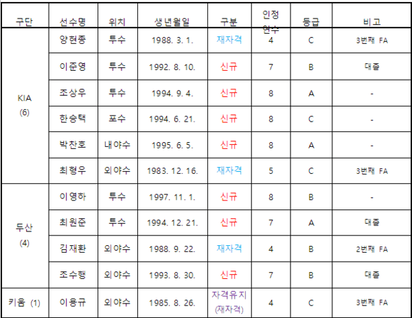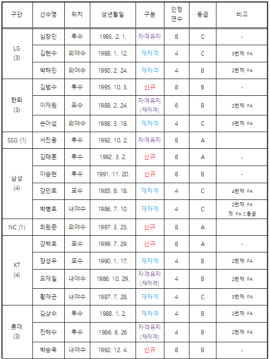 이와 별개로 비FA 다년 계약 체결 선수 및 기존 FA 선수 중 계약 기간 연장 옵션 발동 등으로 FA 자격 요건을 신규 취득 또는 재취득했으나 올해 계약 기간이 종료되지 않은 ‘FA계약 유보선수’ 14명도 함께 공시했다.