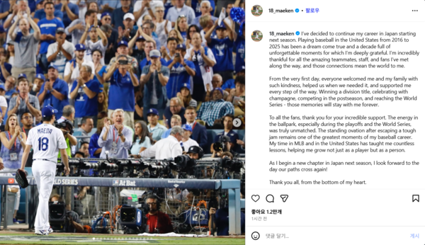 마에다는 “2016년부터 2025년까지 미국에서 야구를 한 것은 꿈이 현실이 된 시간이었고, 잊을 수 없는 순간들로 가득한 10년에 감사하다”라며 “모든 팀 동료들, 스태프, 팬들과의 인연은 정말 소중하다”라고 전했다.