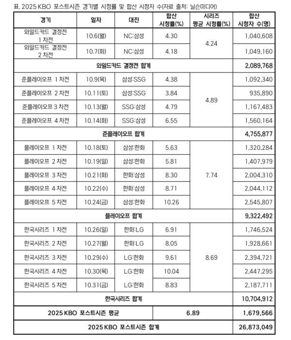 플레이오프 5차전(삼성-한화)은 시청률 10.26%로 254만 5,807명이 시청해 포스트시즌 기간 중 가장 높은 시청률과 시청자 수를 기록했으며, 한국시리즈 4차전(LG-한화)은 244만 7,295명이 시청하며 시청률 10.04%를 기록해 뒤를 이었다.