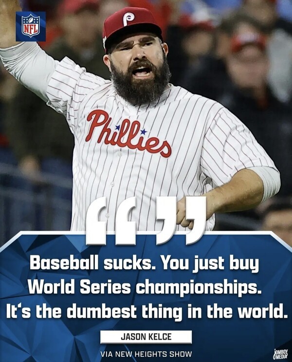 켈시는 최근 자신과 동생 트래비스 켈시가 진행하는 팟캐스트 ‘뉴 하이츠’ 최신 에피소드에서 “야구는 형편없다. 그냥 돈으로 월드시리즈 우승을 사는 거다. 세상에서 가장 멍청한 일이다”라며 불만을 드러냈다.