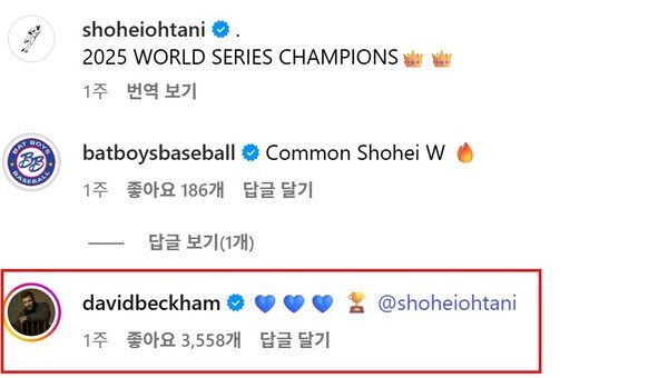 실제로 오타니가 월드시리즈 우승을 알리는 게시글을 올리자, 베컴은 다저스 팀 색깔인 파란 하트 세 개와 트로피 이모티콘으로 축하 댓글을 남겨 전 세계 팬들을 놀라게 했다.