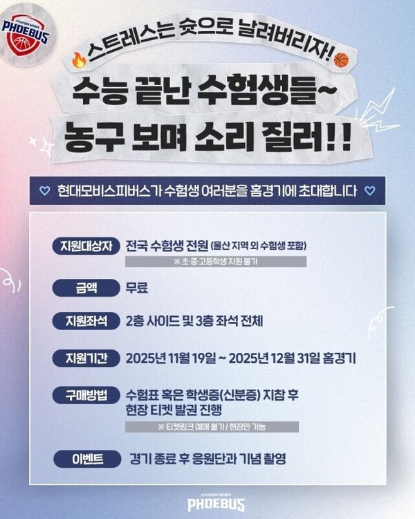[SPORTALKOREA] 이정엽 기자= 울산 현대모비스는 프로농구 2026학년도 대학수학능력시험을 치른 수험생들을 위해 홈경기 무료 티켓 이벤트를 진행한다고 14일 밝혔다.