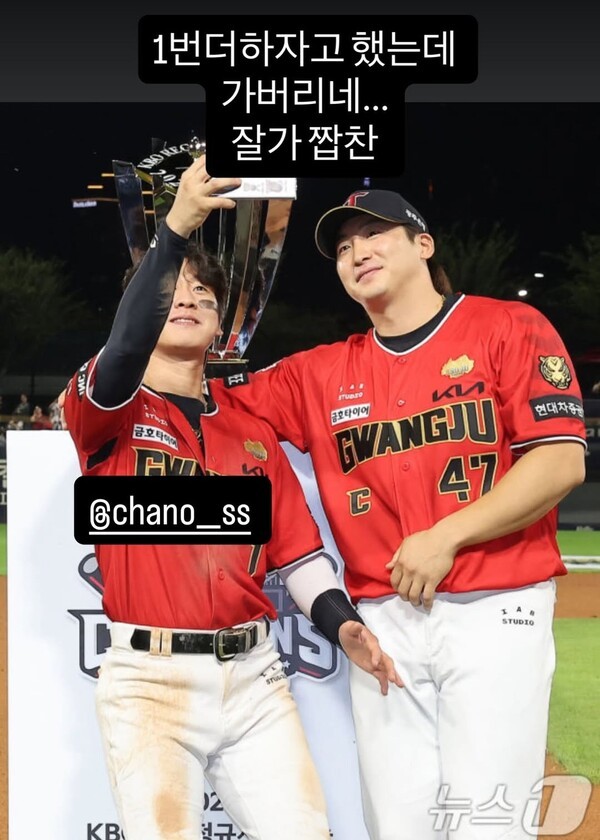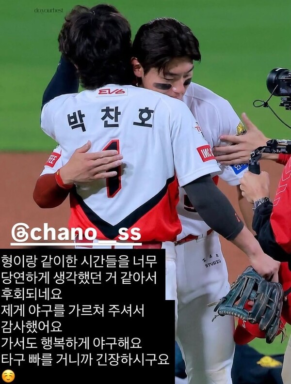 반면, 그를 떠나보낸 동료들은 울상을 지었다. 주장 나성범은 박찬호의 SNS에 “진짜 가는 거야?”라는 댓글을 남기며 착잡한 속내를 드러냈다. 이어 자신의 SNS에는 박찬호와 함께 웃고 있는 사진과 함께 “한 번 더 하자고 했는데 가버리네… 잘 가, 짭찬”이라는 글을 올리며 아쉬움을 전했다.