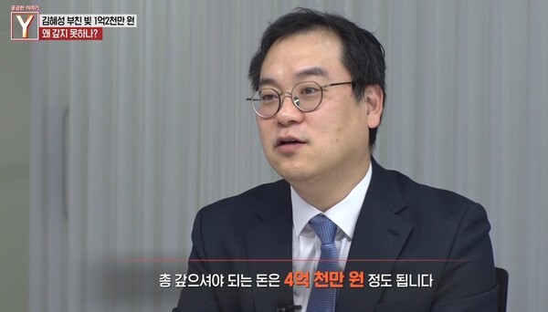 하지만 김 선생의 설명은 달랐다. 김 선생은 연 20% 법정 이자율을 합해 이같은 금액을 요구한 것으로 전해졌다. '궁금한 이야기Y' 측은 변호사를 인용해 "특별한 합의가 없으면 비용-이자-원금 순서대로 충당하게 돼 있다. 전체 이자 2억 9000만 원, 원금 1억 2000만 원 정도 돼서 총 4억 1,000만 원 정도를 갚아야 한다"고 설명했다.