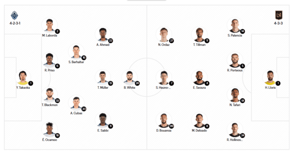이에 맞서는 밴쿠버의 예스페르 쇠렌센 감독은 4-2-3-1 포메이션으로 맞불을 놓는다. 다카오카 요헤이가 골문을 책임지며, 마티아스 라보다-랄프 프리소-트리스탄 블랙먼-에디에르 오캄포가 수비벽을 형성한다. 3선은 세바스찬 버홀터-안드레스 쿠바스가 맡고, 2선에는 알리 아메드-토마스 뮐러-엠마누엘 사비가 이름을 올렸다. 최전방에는 브라이언 화이트가 출격한다.