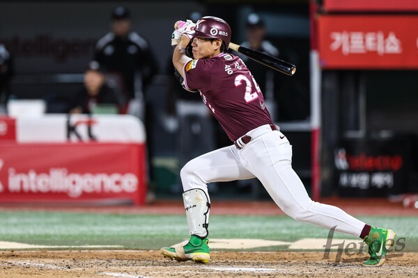 최고의 시즌을 보낸 송성문이다. 올해 144경기에 모두 출전하면서 타율 0.315 26홈런 90타점 OPS 0.917이라는 빼어난 성적을 냈다. 100을 기준으로 선수의 상대적인 타격 생산성을 나타내는 wRC+(조정 득점 생산력) 지표는 164.1로 리그 3위에 달했다.