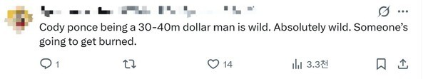 그러나 현지 팬들의 반응은 다소 냉담하다. 해당 소식을 전한 로젠탈 기자의 SNS에는 회의적인 반응이 쏟아졌다. 한 팬은 “코디 폰세가 3,000만~4,000만 달러짜리 선수가 된다는 건 말도 안 된다. 정말 말도 안 된다. 누군가는 이 계약으로 크게 데일 거다”라고 적었고, 다른 한 팬은 “누군가 폰세에게 그 정도 금액을 안긴다면 그 사람은 정신적으로 문제 있는 사람”이라며 날 선 반응을 보였다.