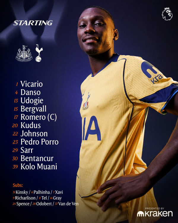 이에 맞서는 토트넘의 토마스 프랭크 감독은 4-3-3 포메이션을 준비했다. 비카리오 골키퍼가 장갑을 꼈고 우도기, 단소, 로메로, 포로가 그를 도와 수비했다. 베리발, 벤탕쿠르, 사르가 중원에 낙점받았다. 최전방에는 존슨, 무아니, 쿠두스가 나섰다.