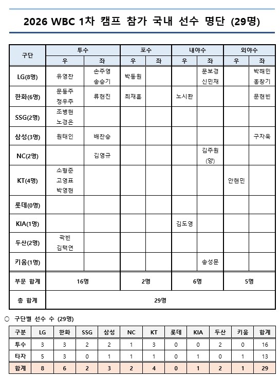 1차 캠프에 참가하는 국내 선수단은 투수 16명, 야수 13명 등 총 29명으로 구성됐다.