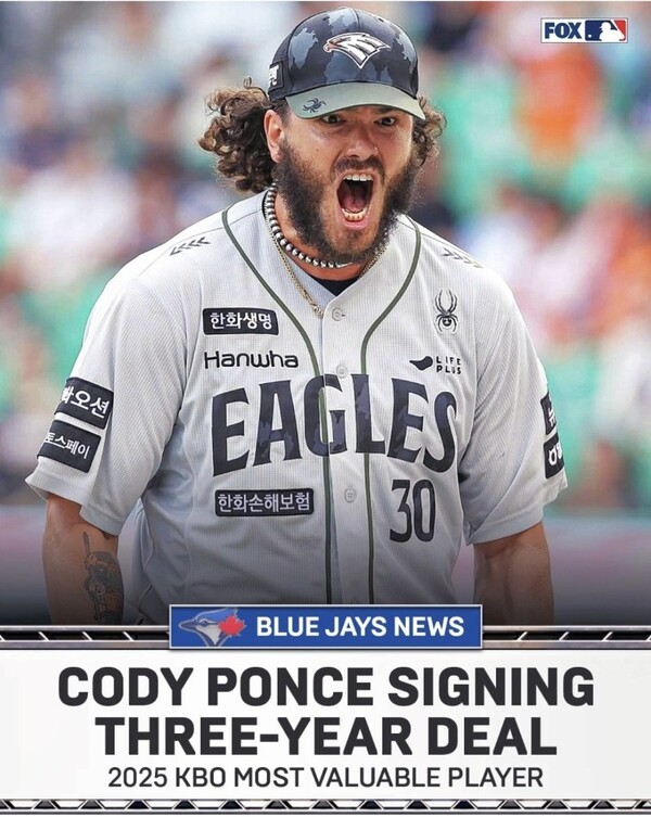 [SPORTALKOREA] 김지현 기자= 전 한화 이글스 에이스 코디 폰세가 메이저리그(MLB) 구단 토론토 블루제이스와 3년 3,000만 달러에 계약을 맺었다.