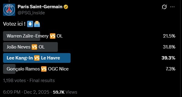 후보군도 만만치 않았다. 워렌 자이르 에메리, 주앙 네베스(이상 올랭피크 리옹전), 곤살루 하무스(OGC 니스전) 등 강력한 득점들이 경쟁에 올랐지만, 이강인은 39.3%의 최다 득표율을 기록하며 당당히 1위를 차지했다.