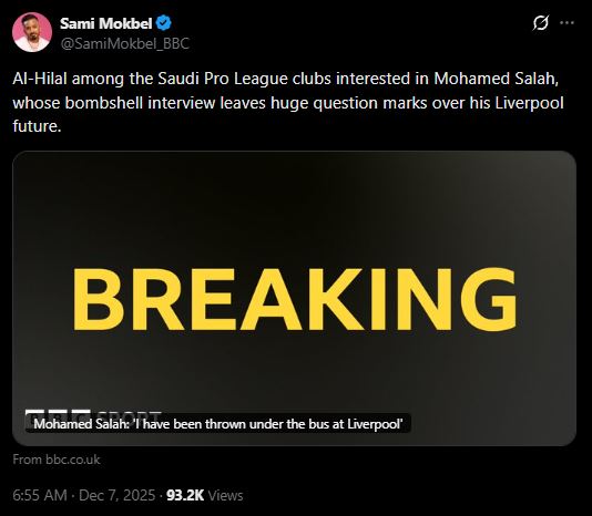 영국 공영방송 ‘BBC’의 공신력 높은 기자 사미 목벨은 7일(한국시간) 자신의 SNS를 통해 “살라가 남긴 충격적인 인터뷰 이후 그의 미래가 큰 물음표로 바뀌었다. 사우디 프로리그 구단 중 알힐랄이 여전히 그에게 깊은 관심을 보이고 있다”고 보도했다.