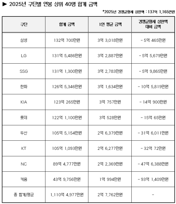 한국야구위원회(KBO)는 18일 2025년 구단별 연봉 상위 40명의 합계 금액을 발표했다.