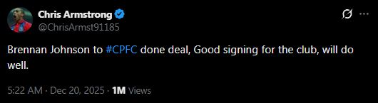 보도에 따르면 크리스털 팰리스와 토트넘에서 모두 활약했던 크리스 암스트롱은 자신의 SNS를 통해“브레넌 존슨의 크리스털 팰리스 이적은 사실상 완료된 딜이다. 클럽에 아주 좋은 영입이 될 것이고, 그는 분명 잘해낼 것” 이라며 사실상 이적을 기정사실화했다.