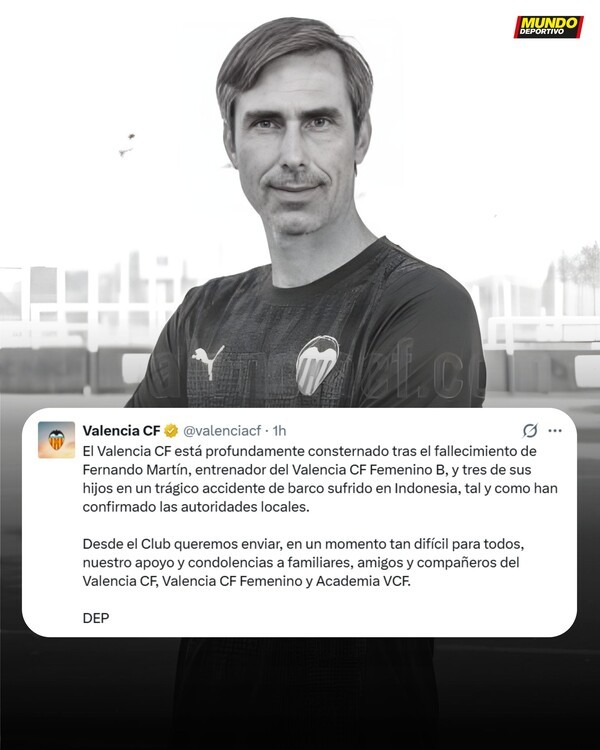 발렌시아 구단 역시 공식 성명을 통해 깊은 슬픔을 나타냈다. 구단은 “현지 당국의 확인에 따라, 인도네시아에서 발생한 비극적인 보트 사고로 발렌시아 여자 B팀 감독 페르난도 마르틴과 그의 자녀 3명이 사망했다는 소식에 깊은 충격과 슬픔을 느낀다”며 “이 어려운 순간에 유가족과 친구들, 여자팀과 아카데미의 모든 동료들에게 진심 어린 위로와 애도를 전한다”고 전했다.