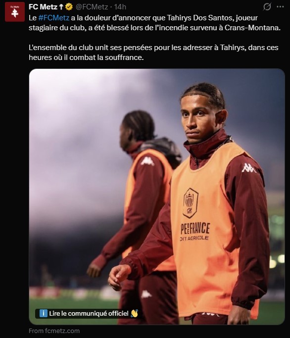 FC 메츠 구단 역시 공식 발표를 통해 깊은 우려와 애도의 뜻을 전했다. 구단은 “크랑몽타나에서 발생한 화재로 인해 구단 소속 연습생 선수 타히리스 도스 산투스가 부상을 입었다는 사실을 매우 비통한 마음으로 전한다”며 “구단 전체가 고통과 싸우고 있는 타히리스에게 마음을 모은다”고 밝혔다.
