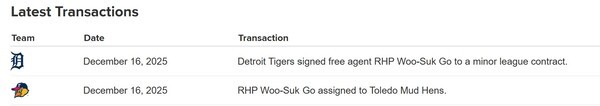 마이너리그 공식 홈페이지 MiLB.com은 최근 고우석의 프로필을 공식 업데이트했다. 이를 통해 고우석이 지난해 12월 디트로이트 타이거스와 계약한 사실이 확인됐다.