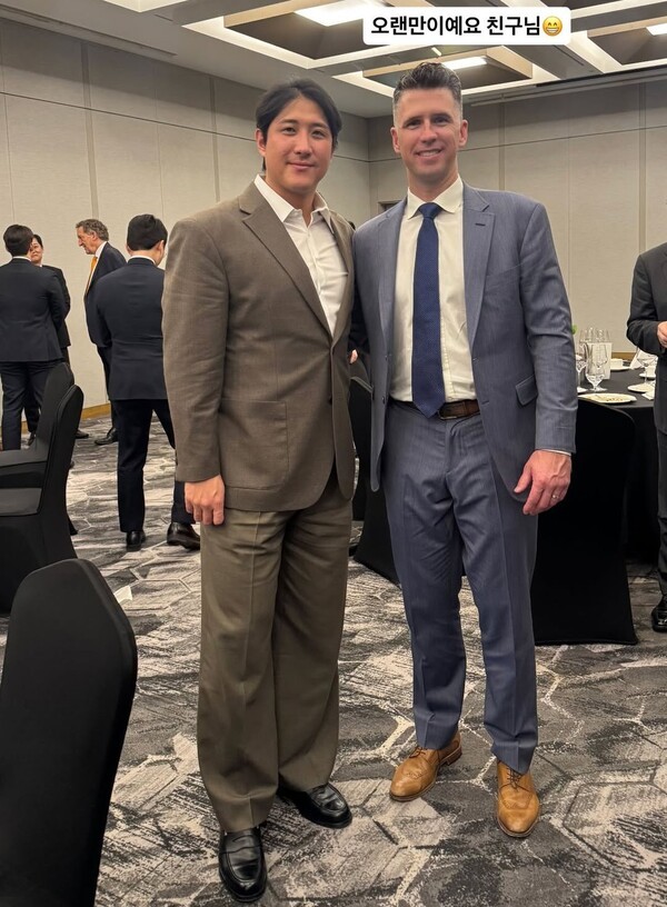 한편, 이날은 황재균이 ‘사장’ 포지와 재회한 자리이기도 했다. 샌프란시스코 구단의 공식 일정이 끝난 뒤 황재균은 자신의 소셜미디어(SNS)에 저녁 만찬 자리에서 포지와 함께 찍은 사진을 공개하며 “오래만이에요 친구님”이라는 글을 남겼다. 동갑내기임에도 극존칭을 사용하며 각별한 존중과 친분을 드러낸 모습이었다.