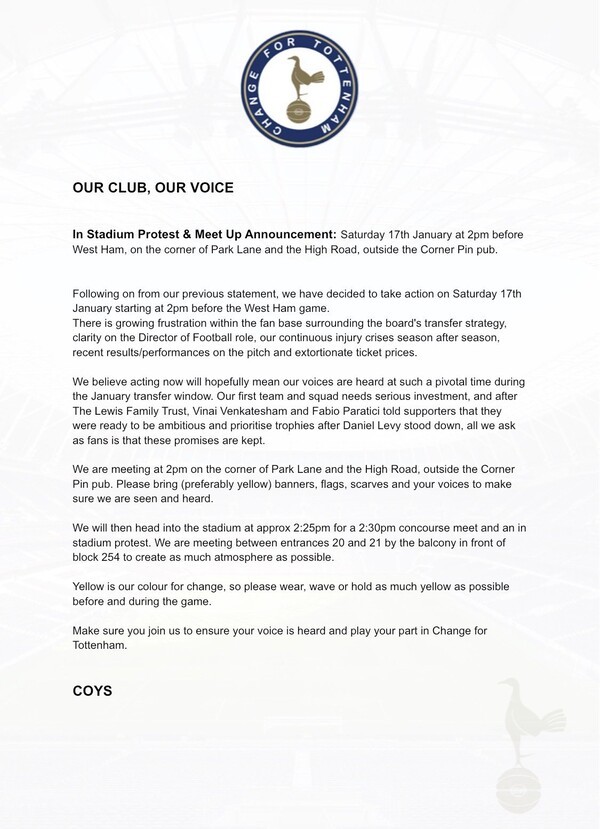 이어 “우리의 1군 스쿼드는 분명한 수준의 투자가 필요하다. 다니엘 레비 회장이 물러난 이후, 루이스 패밀리 트러스트와 비나이 벤카테샴, 파비오 파라티치가 팬들에게 ‘야망을 갖고 트로피를 최우선 목표로 삼겠다’고 약속했다”며“팬으로서 우리가 바라는 것은 단 하나, 그 약속이 지켜지는 것뿐”이라고 덧붙였다.